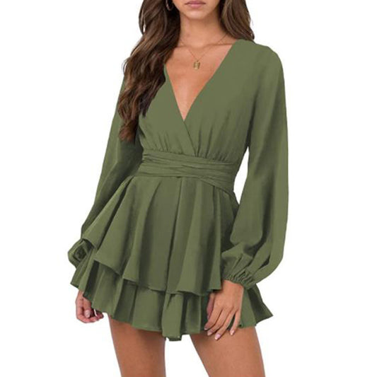 Women's Solid V-Neck Long Sleeve Belt Ruffle Hem Dress