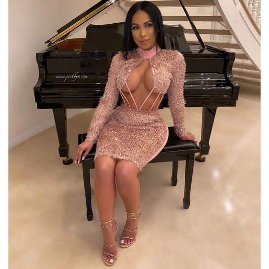 Solid Color Sequin Sexy Wrapped Chest See-through Mesh Dress