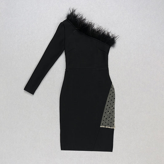 Fur Collar Bandage One-shoulder Long-sleeved Polka Dot Mesh Dress