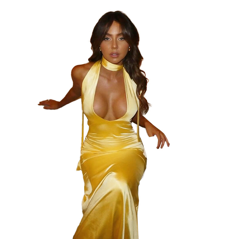 Elegant Sexy Slim Deep V Halter Strap Satin Dress