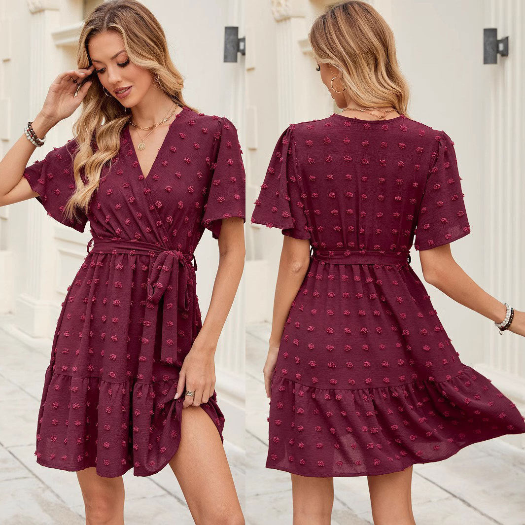 Fur Ball Lotus Leaf Sleeve Solid Color And V-neck Waist Trimming Lace Up Dress