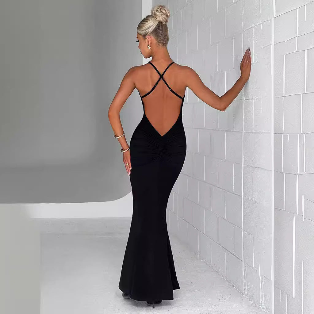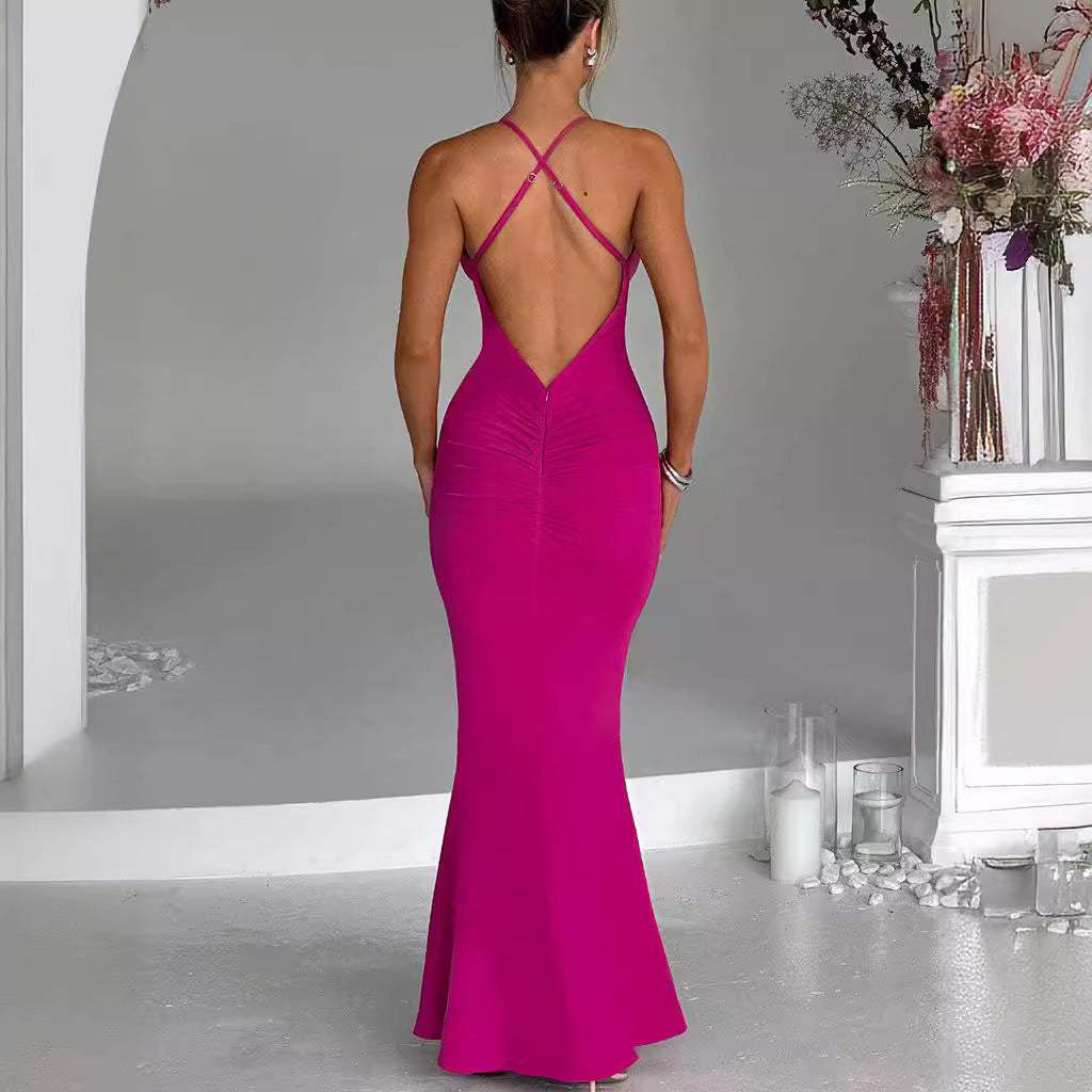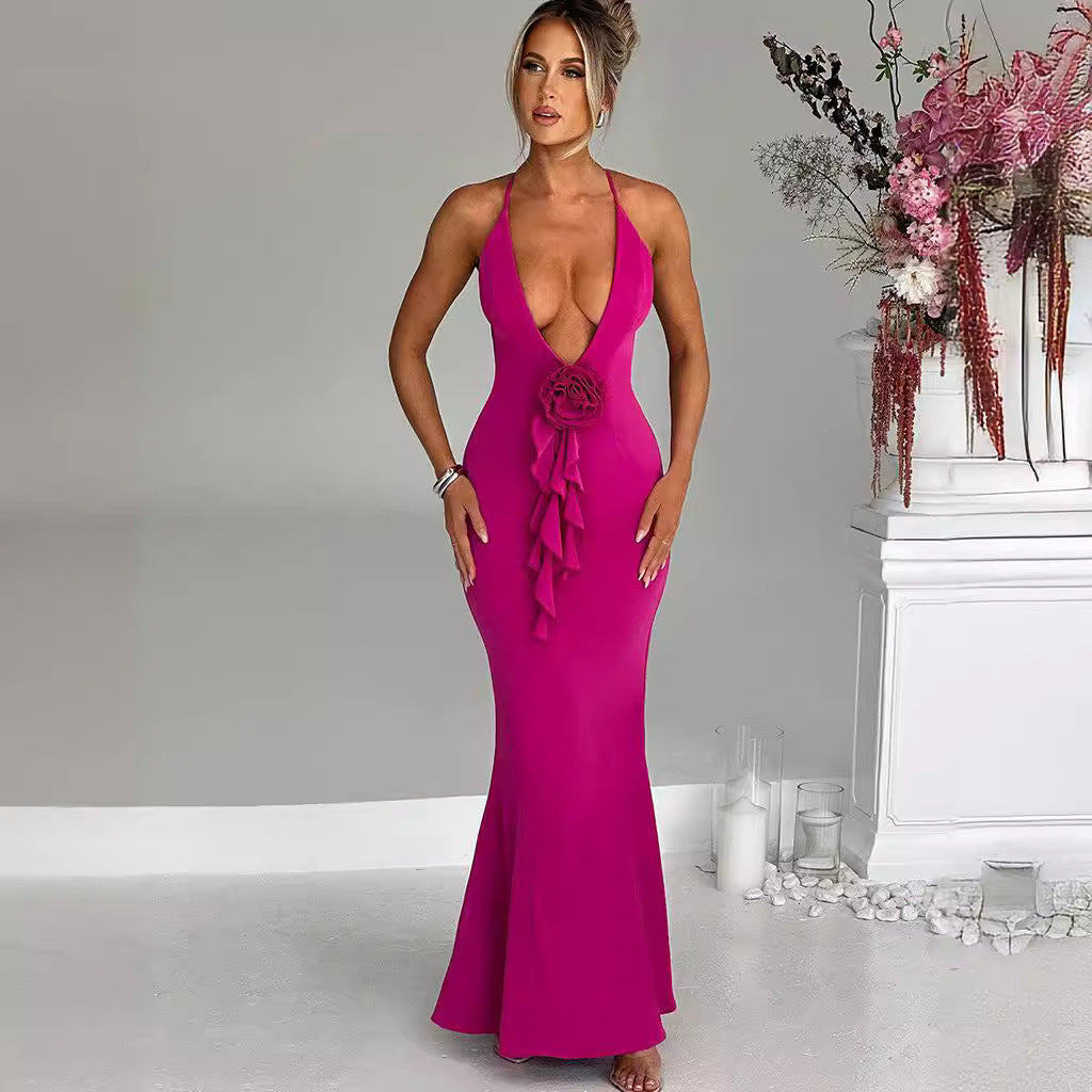 Women's Graceful Personality Pure Color Halter Low-cut Three-dimensional Flower Ruffled Dress
